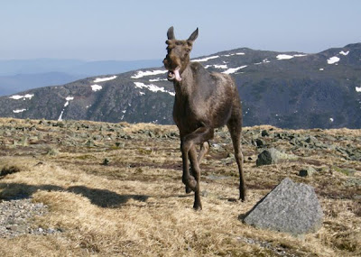 "Hey, is that a moose?" I thought aloud as it dissapeared. What the hell would a moose be doing way up here? Then I saw it again. Comming around the ridge and crossing the road and sure as hell it was a moose. A young one tired and running right for us.